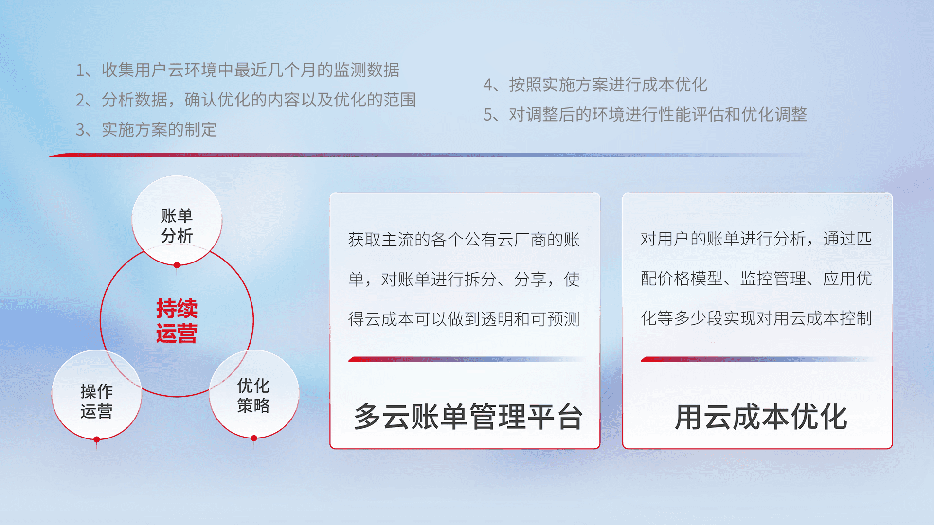 通过多云纳管,,以统一的资源数据模型把客户的云资源进行抽象和封装,,,,进而实现对多云资源的统一操作,,保障云资源管理的可靠性、、、稳定性与可用性。。量身定制化运维内容,,,配置、、开发运维、、补丁管理、、、备份、、、、监控、、认证和访问管理、、、、审计和日常巡检等,,,,保障在用云过程中的可靠度,,,,稳定度以及高可用率。。